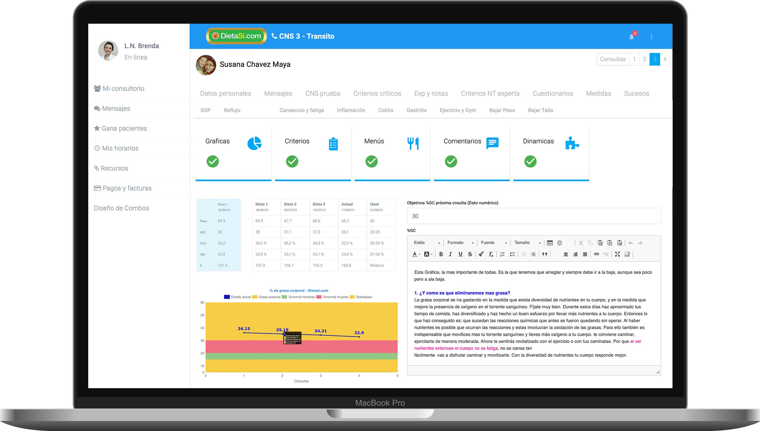 Gestiona fácilmente la información de tus pacientes. Gráficas, menús, criterios, comentarios, dinámicas, mensajes, historial de sucesos, fecha de consultas y recordatorios automáticos.