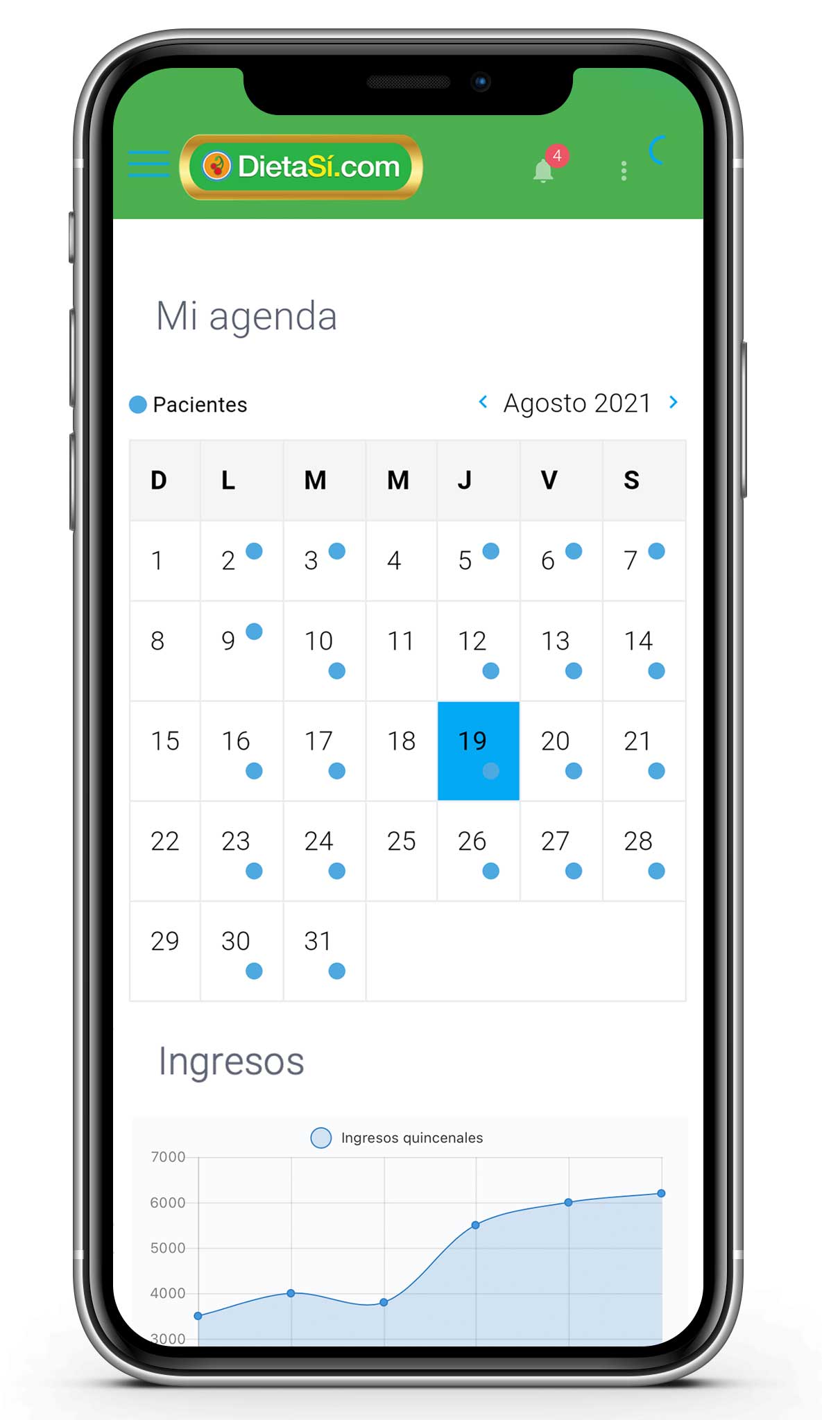 Visión general: Agenda, pacientes de hoy, ingresos, nuevos cursos y capacitaciones, nuevos mensajes.